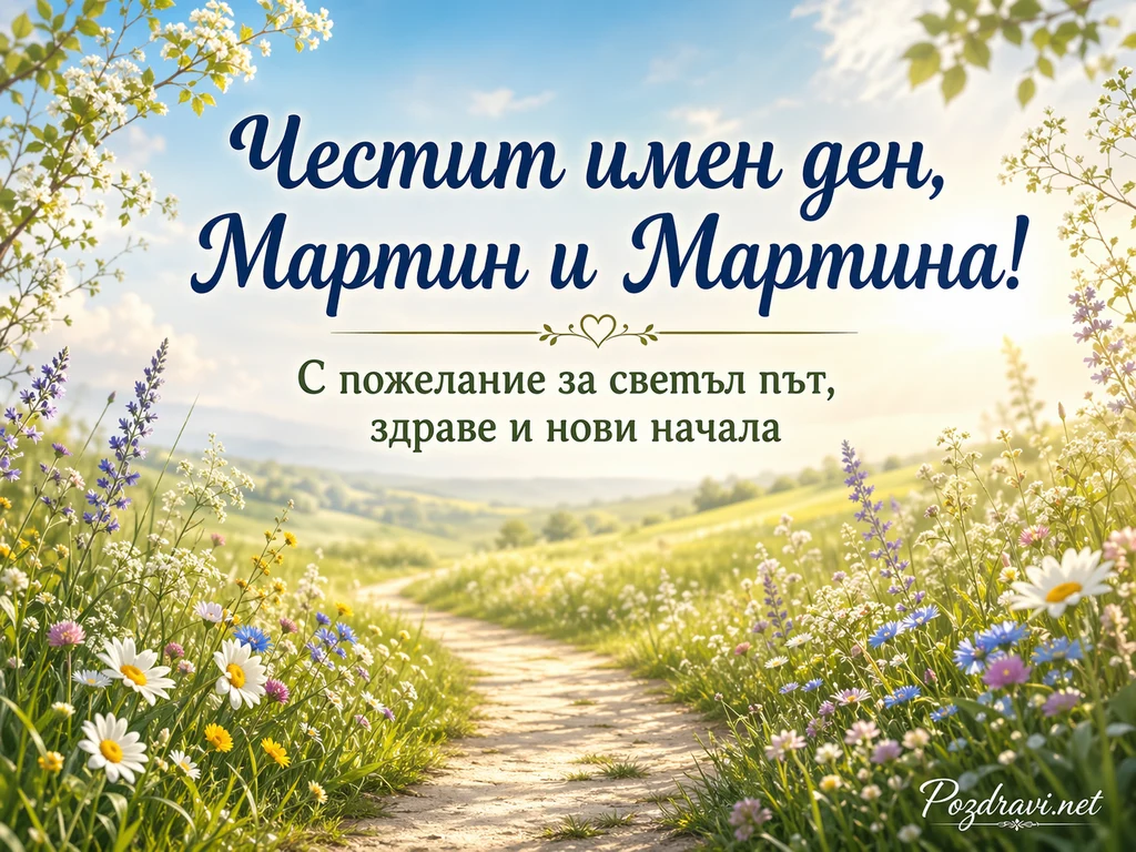 Слънчева пролетна поляна с пътека минава между високи треви, маргаритки и цветни диви цветя. В далечината се виждат меки зелени хълмове и светло небе с нежни облаци. Горните ъгли са обрамчени с цъфтящи клонки и свежи листа, които създават празнично и спокойно настроение. В центъра е изписан голям празничен текст: 'Честит имен ден, Мартин и Мартина!'. Под него има декоративна линия със сърце и допълнителен надпис: 'С пожелание за светъл път, здраве и нови начала'. Цветовете са топли, меки и пролетни, с усещане за радост, надежда и ново начало. Композицията насочва погледа към пътеката, която символично води напред през светлина и цветя.