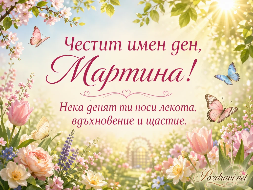 Слънчева пролетна сцена е изпълнена с нежни цветя, зелени листа и мека златиста светлина. В центъра стои празничен надпис: 'Честит имен ден, Мартина! Нека денят ти носи лекота, вдъхновение и щастие.' Около текста летят пеперуди в розови, сини и светложълти нюанси, които придават усещане за лекота и радост. Долната част е богато украсена с лалета, божури, маргаритки, дребни розови цветчета и лилави пролетни стръкове. Фонът напомня светла градина с разцъфнали растения, меки отблясъци и далечна декоративна порта. Цялостното настроение е топло, празнично и много нежно, подходящо за имен ден на жена с име Мартина.