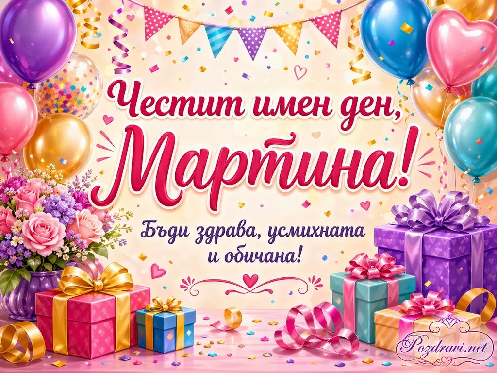 Ключови фрази: имен ден на Мартина, картичка за Мартина, честит имен ден Мартина, празник с балони и подаръци