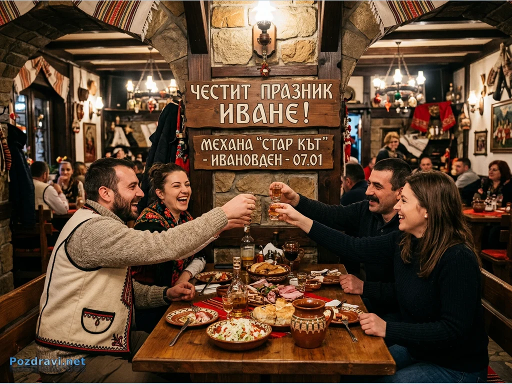 Четирима души празнуват оживено в традиционна българска механа, вдигайки наздравици с малки чаши. Масата е отрупана с разнообразни ястия и напитки, а лицата им са озарени от усмивки и смях, създавайки весела и празнична атмосфера. Интериорът е автентичен, с каменни стени, дървени греди и фолклорни елементи, включително табела 'ЧЕСТИТ ПРАЗНИК ИВАНЕ!' и 'МЕХАНА 'СТАР КЪТ' - ИВАНОВДЕН - 07.01'. Един от мъжете носи традиционна жилетка, а една от жените е с шарена кърпа, подчертавайки българския дух на събитието.