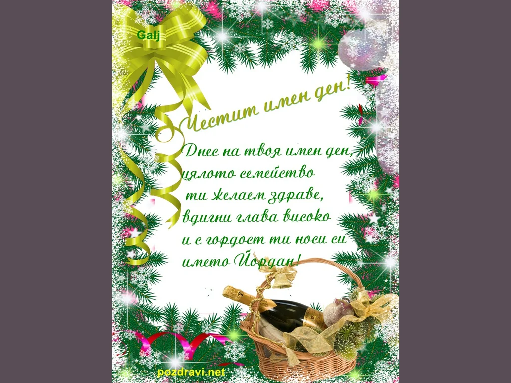Ключови фрази: Картичка шампанско кошница панделки новогодишна украса звездички снежинки борови клонки честит имен ден Йордан поздрави пожелание семейно здраве щастие късмет радости много успехи
