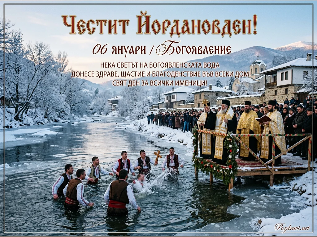 Снимката показва традиционно честване на Йордановден в заснежен зимен пейзаж. В преден план няколко мъже в народни носии са нагазили в ледената река, като един от тях току-що е извадил кръста, предизвиквайки пръски. На дървен кей до брега, православни свещеници в празнични одежди извършват ритуал, наблюдаван от множество хора, събрани по брега. Заснежени дървета, традиционни къщи и планински върхове допълват живописната обстановка под ясно синьо небе. Надписът 'Честит Йордановден!' и пожелания са изписани в горната част на картичката.