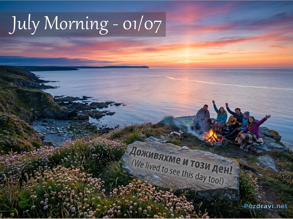 Група приятели посрещат изгрева на слънцето на 1 юли, събрани около огън на скалист бряг. Небето е обагрено в красиви оранжеви, розови и лилави нюанси, отразяващи се в спокойните морски води. В преден план се виждат цъфтящи полски цветя и камък с надпис 'Доживяхме и този ден!'. Атмосферата е празнична и изпълнена с радост, докато младежите махат с ръце и свирят на китара. Надписът 'July Morning - 01/07' допълва посланието на картината.