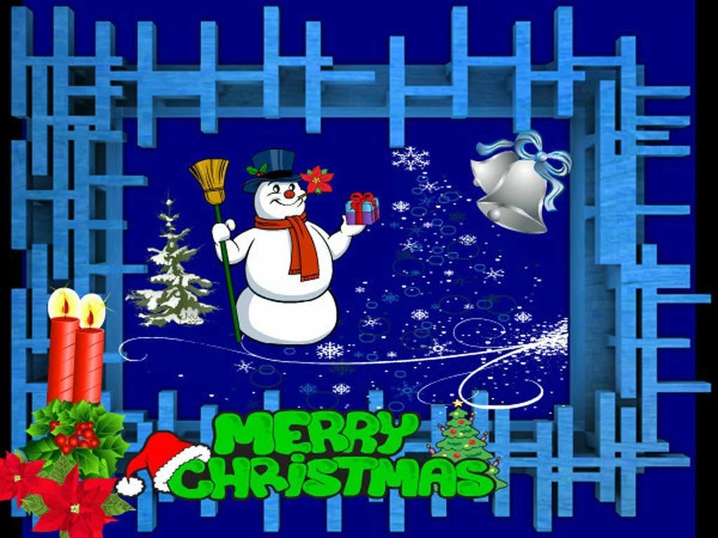 Ключови фрази: Картичка щастлива Коледа синьо коледна звезда звънчета снежинки снежен човек коледна звезда свещи празник поздрави пожелание