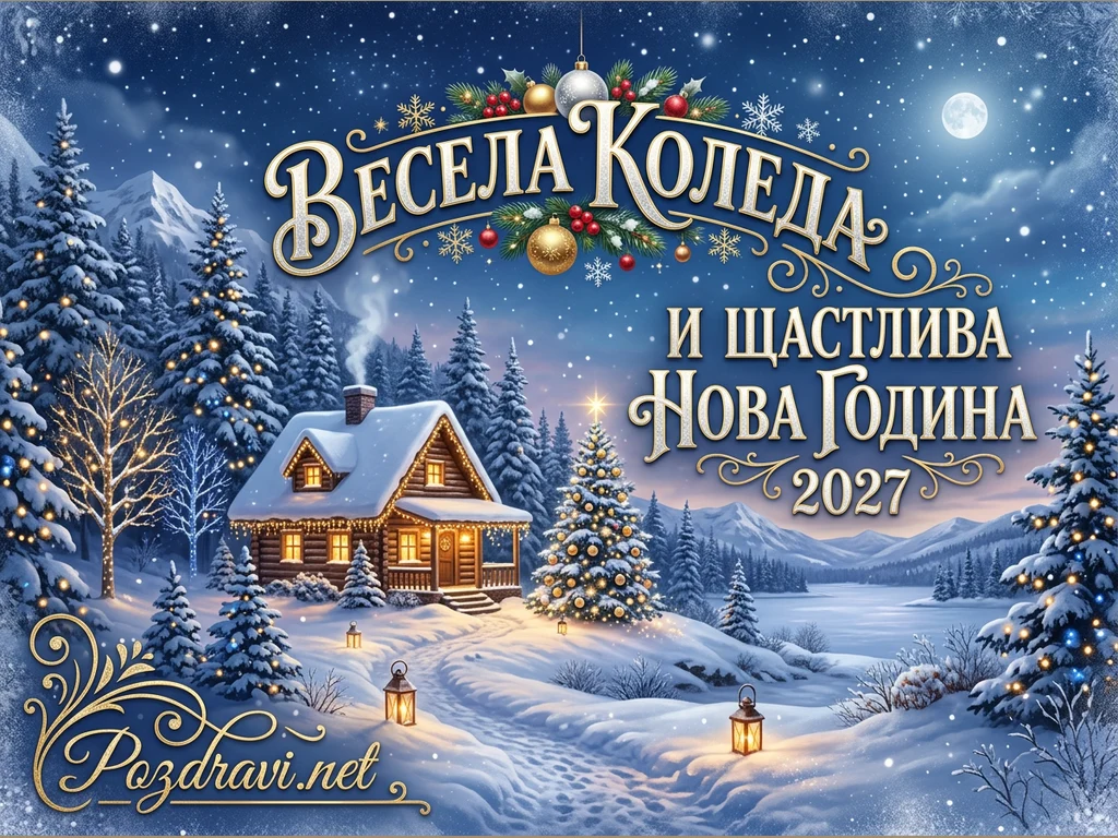 Ключови фрази: Коледна картичка, Нова година 2027, Зимна приказка, Празнични пожелания, Заснежена къща