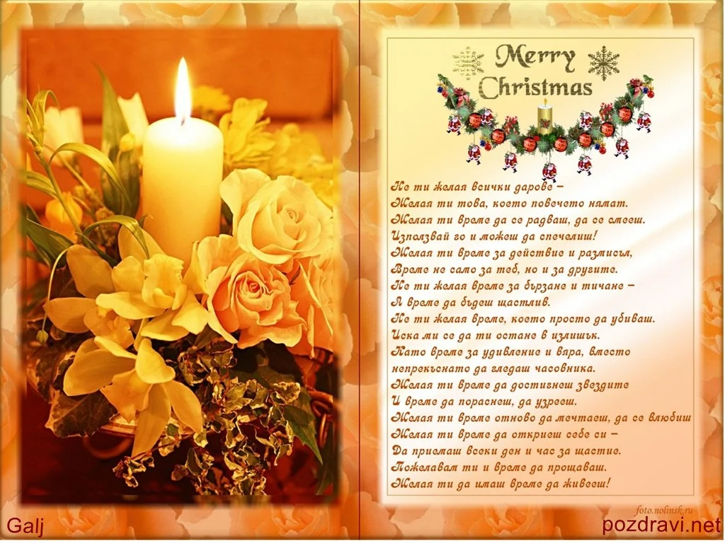 Ключови фрази: Честита коледа картичка пожелания поздрави горяща свещичка букет жълти рози нарциси