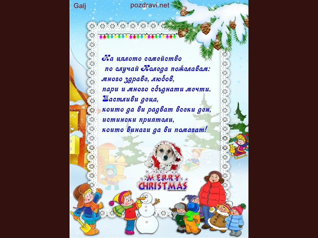 Ключови фрази: Честита коледа семейство деца радост настроение любов снежен човек куче сняг борови клонки игри поздрави пожелания подаръци