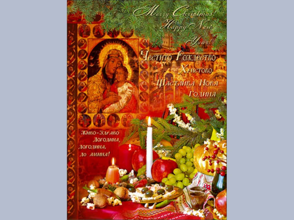 Ключови фрази: Картичка икона дева Мария Младенец празнична коледна постни ястия трапеза погача свещ огън пламъче борови клонки поздрави пожелание щастлива нова година