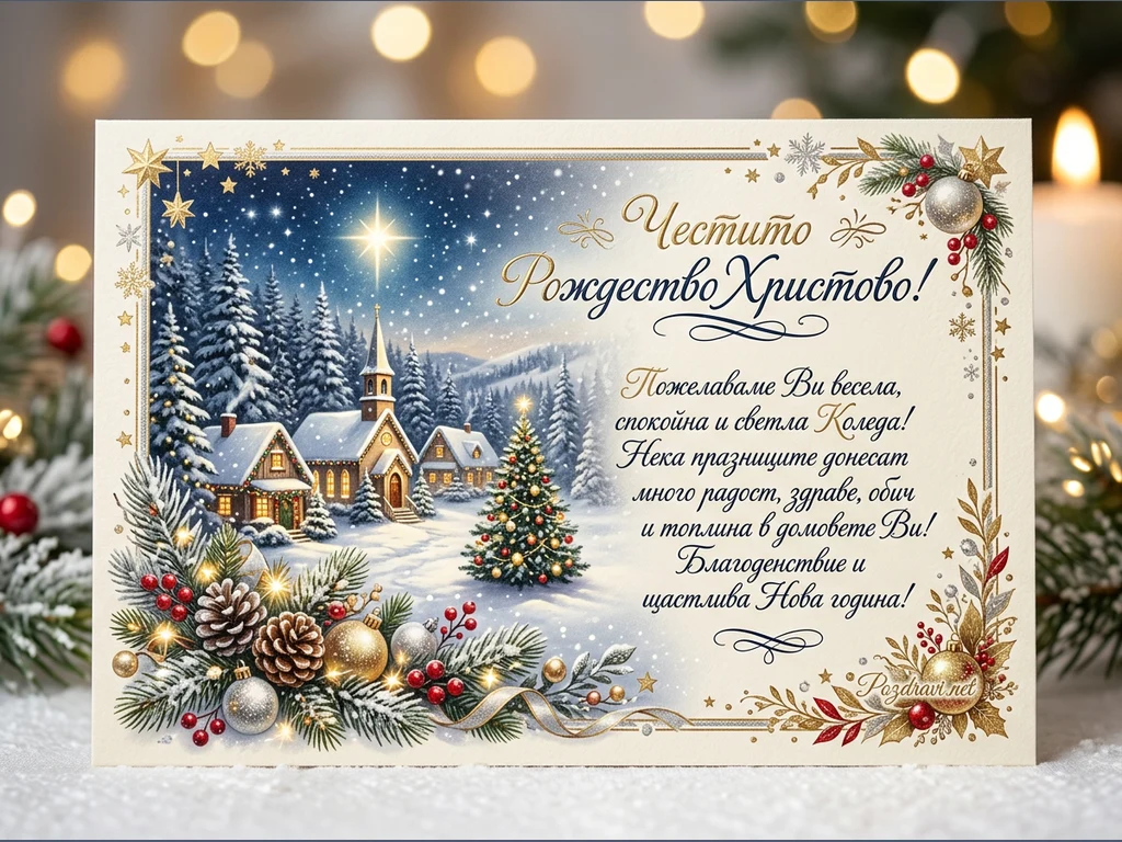 Тази празнична картичка изобразява идилична зимна сцена, покрита със сняг, включваща църква, няколко къщи със светещи прозорци и богато украсена коледна елха. Над всичко това се издига звездно небе с ярка Витлеемска звезда, а по краищата на картичката има декорации от елхови клонки, шишарки, червени плодове и блестящи топки. Върху нея е изписано 'Честито Рождество Христово!' и сърдечно пожелание за весела, спокойна и светла Коледа, изпълнена с радост, здраве, обич и топлина. Пожеланието завършва с 'Благоденствие и щастлива Нова година!', а фонът е разфокусиран с топли, златисти светлини, които допълват празничната атмосфера.