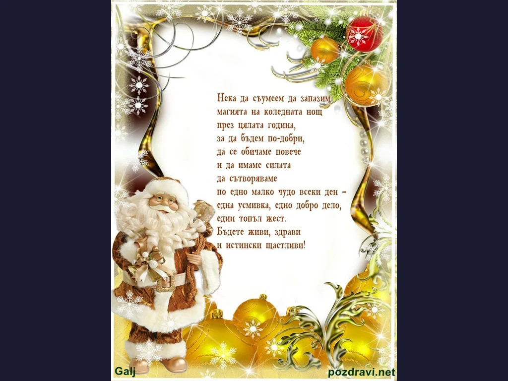 Ключови фрази: Весело посрещане поздрави пожелания дядо коледа украса борови клонки перлички сняг снежинки магия коледна нощ