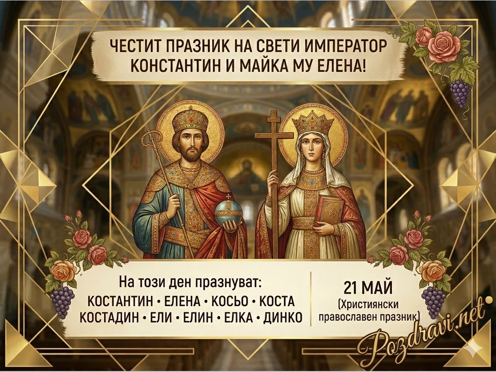 Картичката представя модерен и изискан прочит на празника, съчетавайки класическите образи на светците с деликатни геометрични златни елементи.