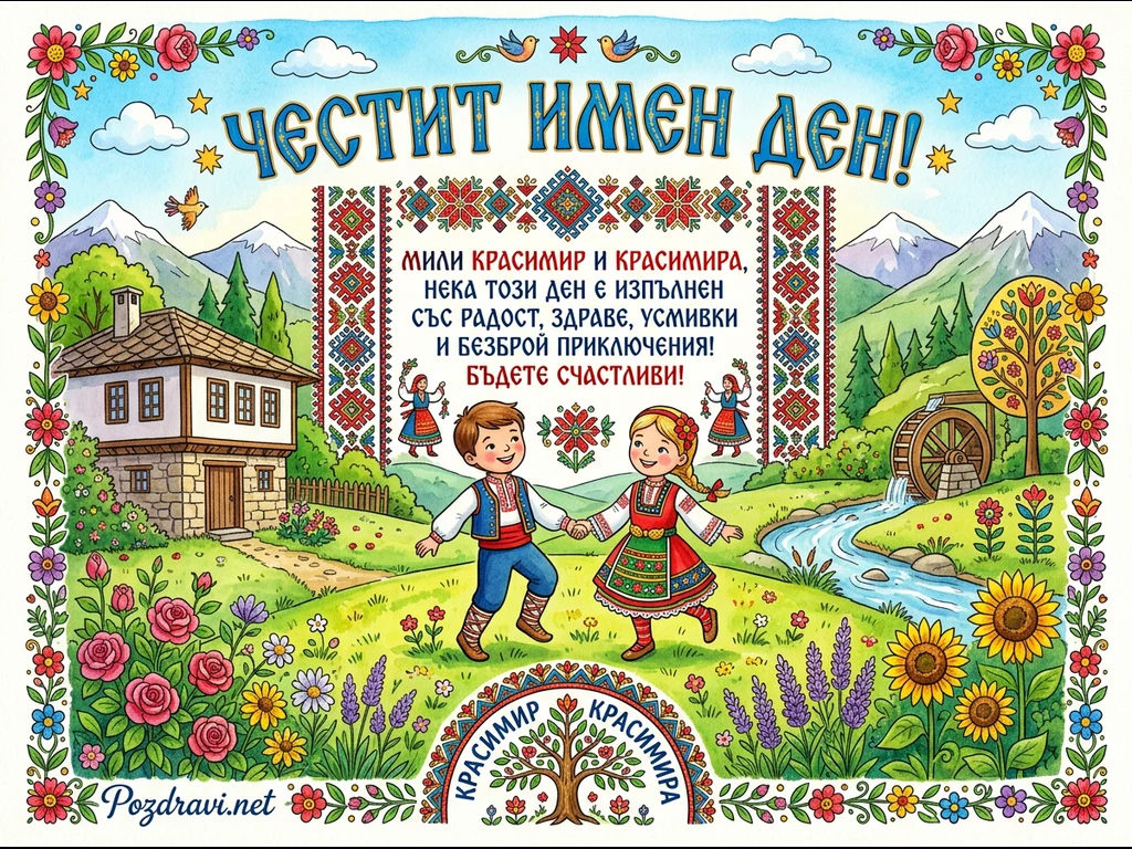 Ярко илюстрирана сцена показва живописна българска природа с традиционна къща, заснежени планини и река с воденица. В центъра на композицията са усмихнати момче и момиче в народни носии, държащи се за ръце. Цялото изображение е обградено от цветна флорална рамка и украсено с традиционни български шевици. В горната част е изписано 'ЧЕСТИТ ИМЕН ДЕН!', а под него има пожелание за радост, здраве и приключения, адресирано до Красимир и Красимира. Стилът е весел и празничен, напомнящ акварелна рисунка.