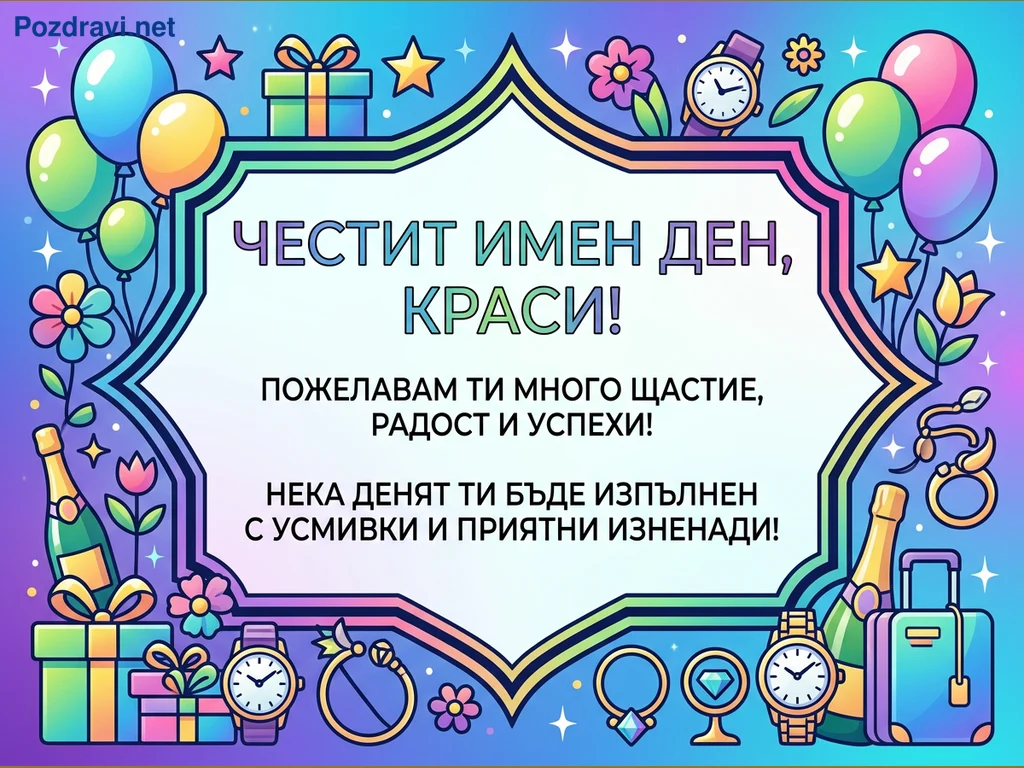 Тази ярка и цветна поздравителна картичка е посветена на имен ден. В центъра ѝ е разположен бял рамкиран панел с надпис 'ЧЕСТИТ ИМЕН ДЕН, КРАСИ! ПОЖЕЛАВАМ ТИ МНОГО ЩАСТИЕ, РАДОСТ И УСПЕХИ! НЕКА ДЕНЯТ ТИ БЪДЕ ИЗПЪЛНЕН С УСМИВКИ И ПРИЯТНИ ИЗНЕНАДИ!'. Рамката е обградена от множество празнични елементи в карикатурен стил, включващи балони, подаръчни кутии, цветя, часовници, пръстени, бутилка шампанско и куфар. Фонът е градиент от лилаво, синьо и зелено, украсен с искрящи звездички, създаващи весело и празнично настроение.