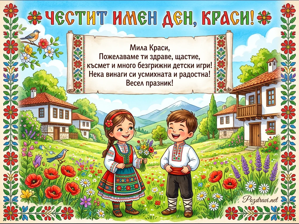 Тази цветна картичка за имен ден изобразява две усмихнати деца в традиционни български носии, стоящи сред живописна поляна, осеяна с макове, маргаритки и други полски цветя. Момиченцето държи букет, а момченцето е до нея, на фона на типични възрожденски къщи и зелени хълмове. В горната част има свитък с лично послание 'Мила Краси, Пожелаваме ти здраве, щастие, късмет и много безгрижни детски игри! Нека винаги си усмихната и радостна! Весел празник!', а над него е надписът 'ЧЕСТИТ ИМЕН ДЕН, КРАСИ!'. Цялата композиция е обградена от красива рамка с български шевици, придаваща празничен и национален дух.