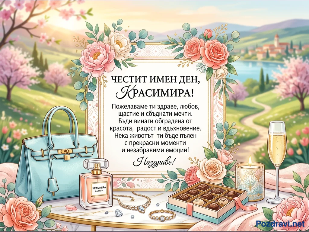 Тази празнична картичка за имен ден е изпълнена с нежност и елегантност. В центъра ѝ е разположено рамкирано послание 'ЧЕСТИТ ИМЕН ДЕН, КРАСИМИРА!', обградено от красиви розови и бели цветя. На преден план, върху мраморен плот, са подредени луксозни подаръци като светлосиня чанта, парфюм 'KRASIMIRA PARFUM', изящни бижута, кутия шоколадови бонбони, чаша шампанско и ароматна свещ. Фонът разкрива живописен пролетен пейзаж с цъфнали дръвчета, езеро и далечен град, създавайки усещане за спокойствие и красота. Цялостната композиция е светла, радостна и излъчва празнично настроение.