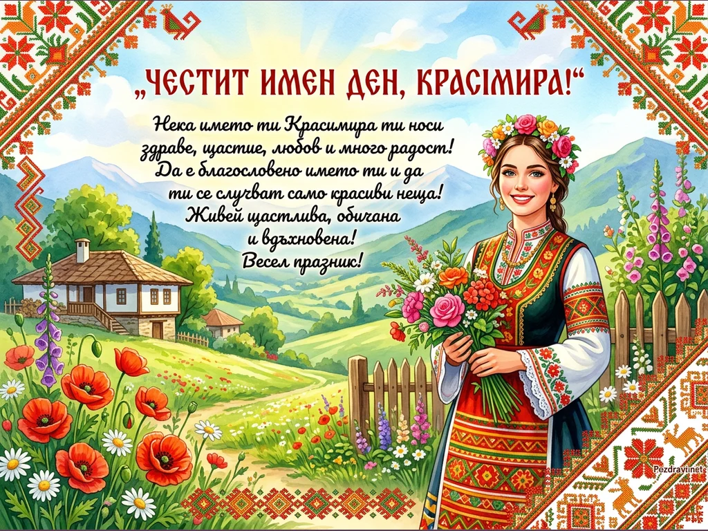 Тази ярка поздравителна картичка е посветена на имен ден, с централен надпис 'ЧЕСТИТ ИМЕН ДЕН, КРАСИМИРА!'. На нея е изобразена усмихната млада жена в красива българска носия, държаща букет от пъстри цветя. Фонът е живописен селски пейзаж с тучни зелени хълмове, традиционна българска къща и поле от червени макове и бели маргаритки. Цялата композиция е обградена от богато орнаментирана рамка с традиционни български шевици, придаващи автентичен и празничен вид.
