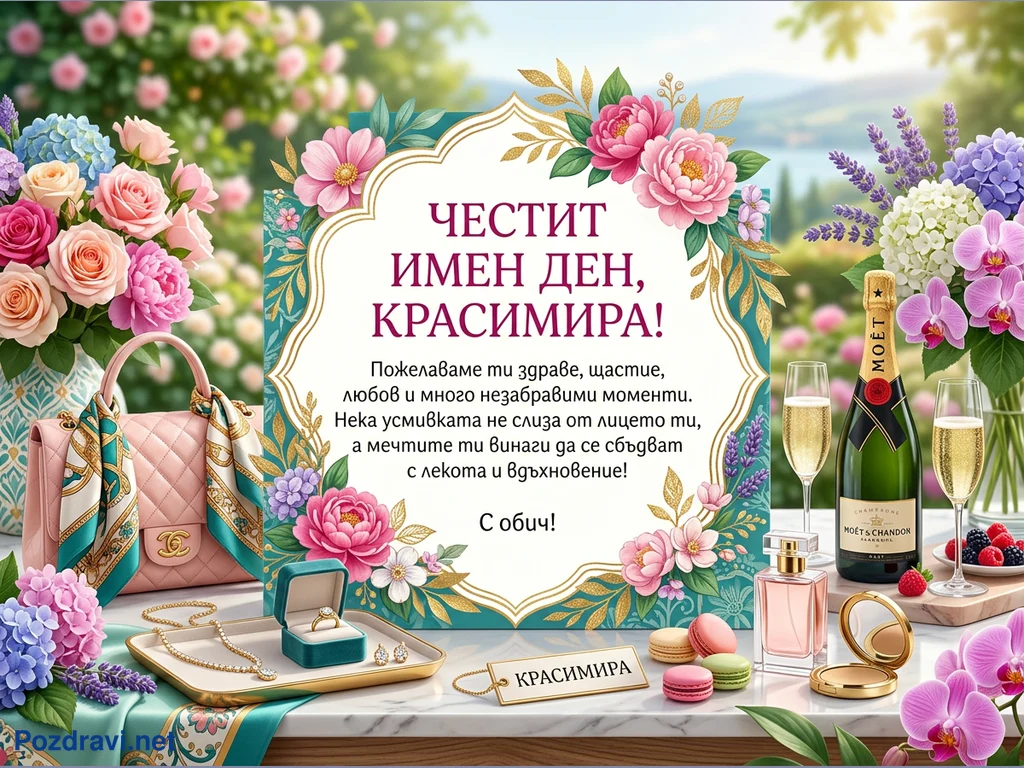 Празнична композиция с централно разположена поздравителна картичка, адресирана до Красимира, е заобиколена от луксозни подаръци и елегантни елементи. Отляво са аранжирани букет от нежни рози, розова капитонирана чанта, златисти бижута и цветни макарони. Отдясно се виждат бутилка шампанско Moët & Chandon с две пълни чаши, букет от орхидеи, лавандула и хортензии, както и парфюм и свежи горски плодове. Фонът е разфокусирана пролетна градина с цъфтящи храсти и далечен живописен пейзаж. Цялостната сцена излъчва празничност, женственост и изисканост.