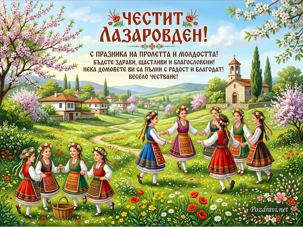 Ключови фрази: Лазаровден картичка, български традиции, пролетен празник, народни носии, честит Лазаровден