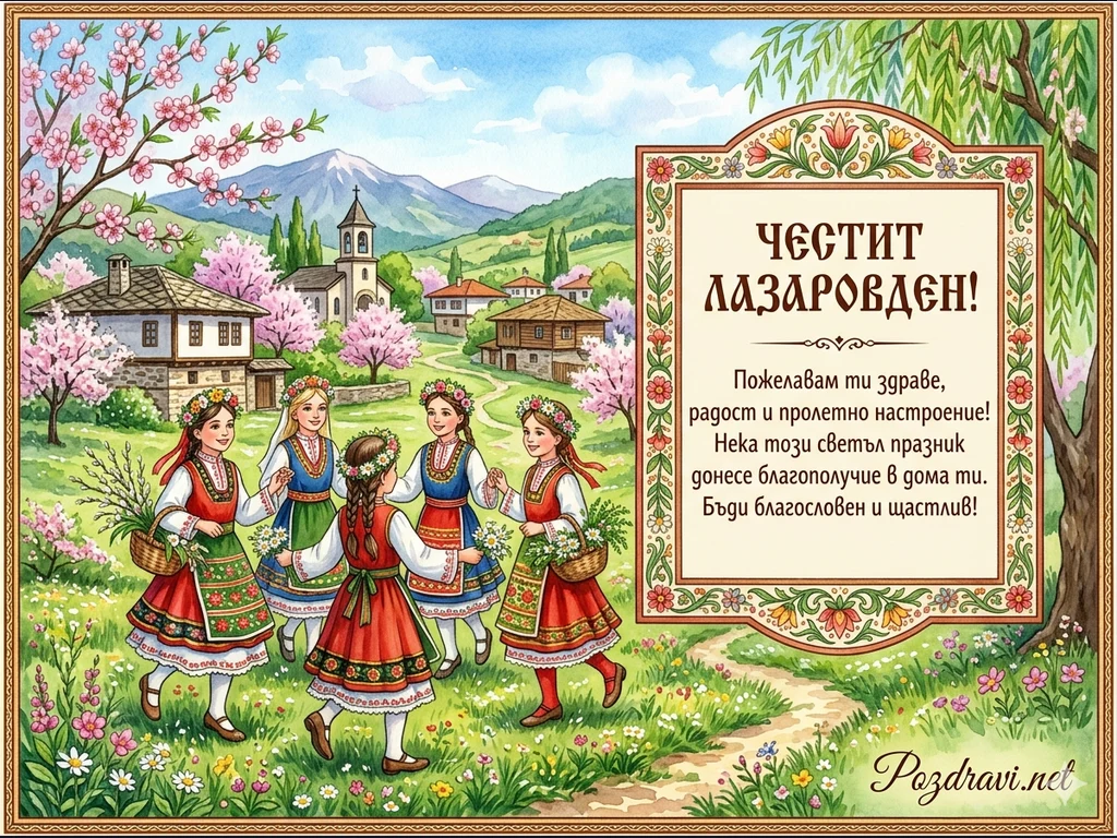 Тази празнична картичка е създадена в топъл, акварелен стил, улавящ магията на българските традиции. На преден план са изобразени млади девойки (лазарки) в традиционни народни носии, които танцуват в цветна пролетна ливада. Фонът разкрива идиличен селски пейзаж с възрожденски къщи, цъфнали овошки и меките очертания на планината под ясно синьо небе.