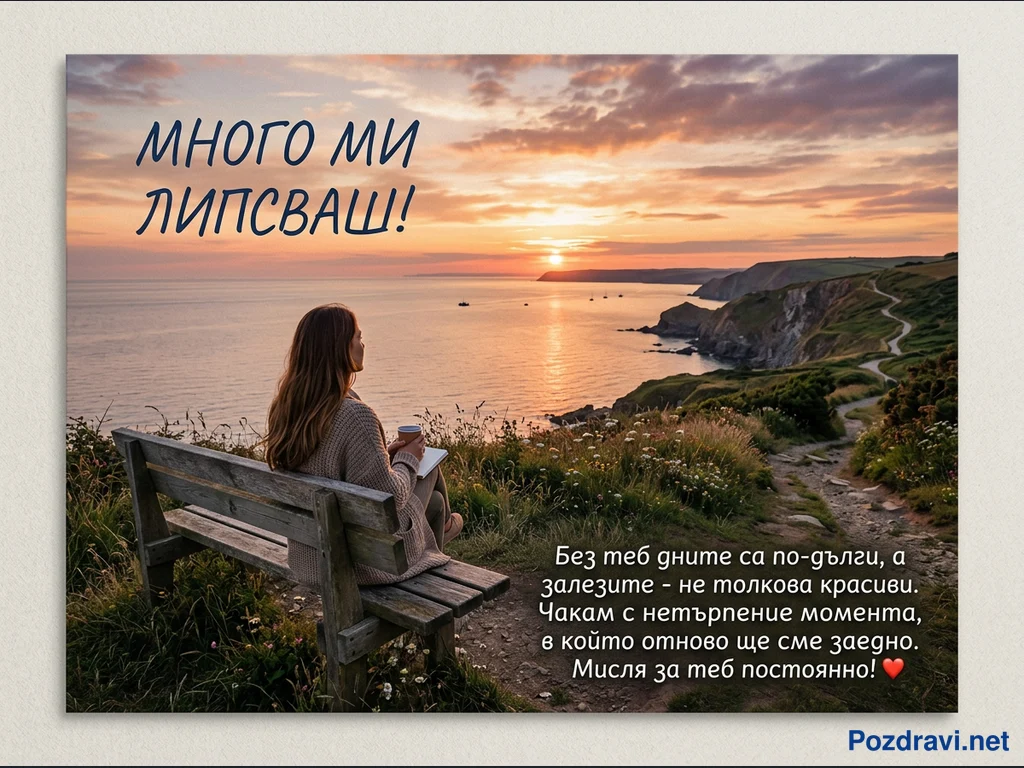 На картичката е изобразена жена, седнала на дървена пейка на скалист бряг, вгледана в живописен залез над морето. Небето е обагрено в топли оранжеви и розови нюанси, отразяващи се във водите, а по хоризонта се виждат очертанията на отдалечени скали и плаващи лодки. Жената държи чаша и книга, докато съзерцава спокойния пейзаж. В горния ляв ъгъл е изписано 'МНОГО МИ ЛИПСВАШ!', а в долния десен ъгъл има емоционално послание за копнеж по любим човек. Цялостната композиция създава усещане за носталгия и очакване.