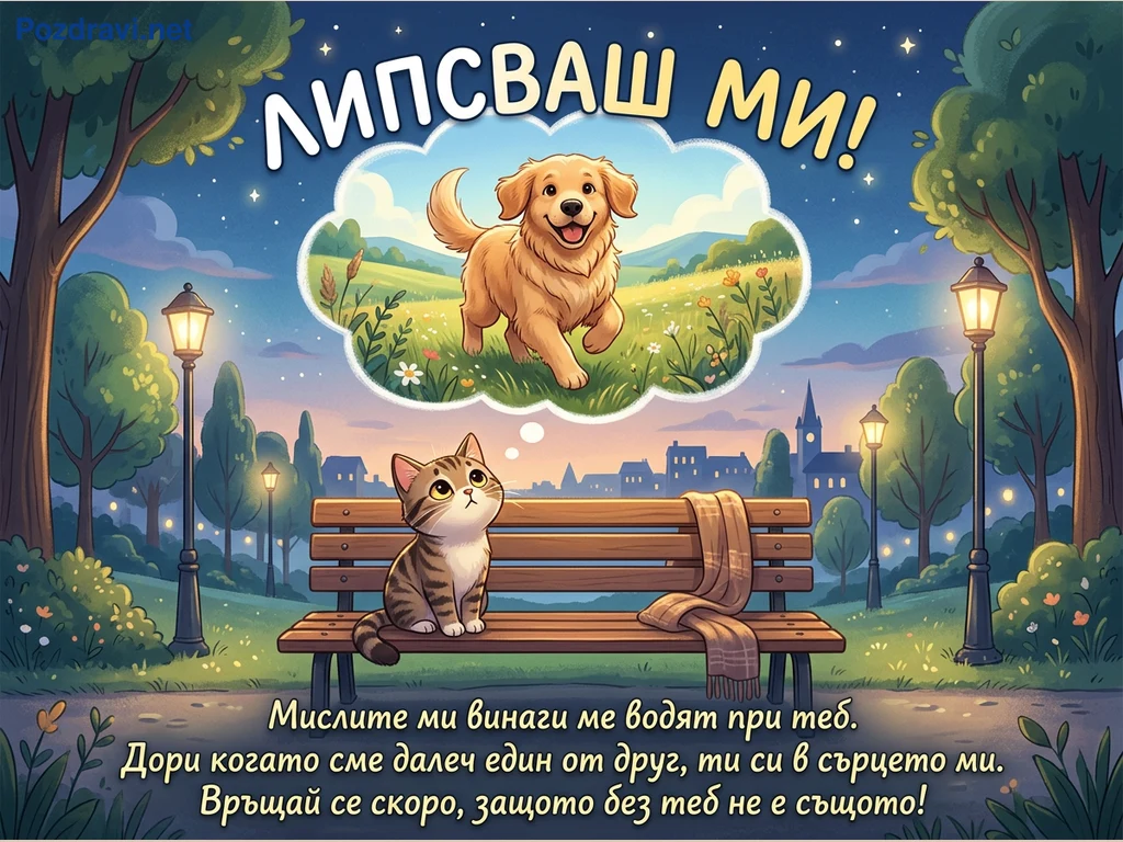 Тази илюстрация в анимационен стил показва котка, седнала на пейка в парк по здрач, гледаща нагоре към небето. Над нея, в облаче за мисли, е изобразено щастливо златисто куче, тичащо през слънчева поляна с цветя. Паркът е осветен от улични лампи, а на заден план се виждат дървета и силуети на сгради под звездно небе. В горната част на картичката е изписано 'ЛИПСВАШ МИ!', а в долната част има послание за копнеж и приятелство.