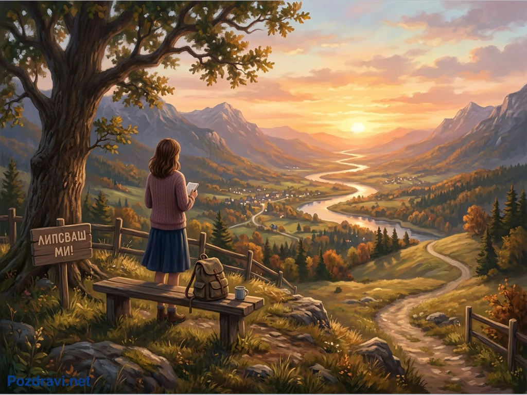 Ключови фрази: Есенен пейзаж, залез планина, жена чете, долина река, Липсваш ми табела