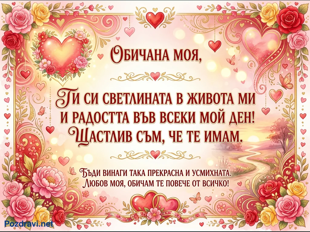 Тази романтична картичка е изпълнена с нежни розови и червени нюанси, подчертани със златни орнаменти и блещукащи светлини. Тя е богато декорирана с множество сърца, разцъфнали рози в червено, розово и жълто, както и елегантни пеперуди. В центъра е изписано любовно послание: 'Обичана моя, Ти си светлината в живота ми и радостта във всеки мой ден! Щастлив съм, че те имам. Бъди винаги така прекрасна и усмихната. Любов моя, обичам те повече от всичко!'. Фонът включва живописен пейзаж с извиваща се пътека към залез или изгрев, което придава допълнителна дълбочина и романтика на сцената. Цялостният дизайн излъчва топлина, обич и празнично настроение, идеално за изразяване на дълбоки чувства.