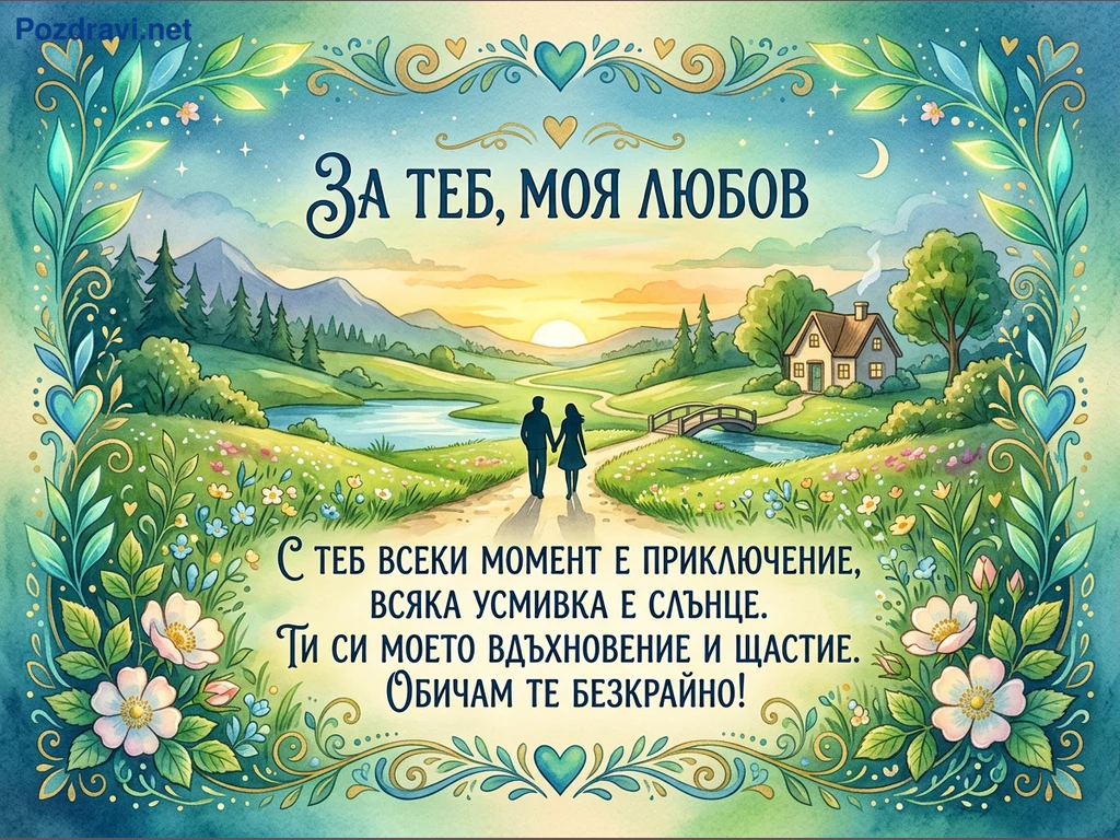 Тази акварелна картичка изобразява романтичен пейзаж по изгрев или залез слънце. В центъра, влюбена двойка върви ръка за ръка по пътека, водеща към хоризонта, където слънцето огрява небето. Около тях се простират зелени хълмове, река с мостче и уютна къщичка, обградени от поляни с цветя. Картичката е украсена с нежна флорална рамка от листа и сърца, а посланието гласи 'ЗА ТЕБ, МОЯ ЛЮБОВ' и 'ОБИЧАМ ТЕ БЕЗКРАЙНО!'.