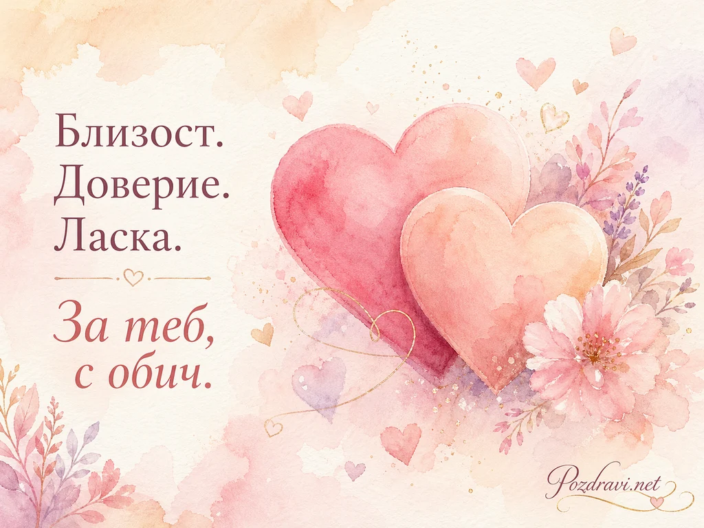 Върху светъл акварелен фон в нюанси на розово, прасковено и лилаво са разположени големи сърца. Композицията е нежна и романтична, с ефект на рисувани с вода петна и меки преходи по целия лист. Вляво стои текстът 'Близост. Доверие. Ласка. За теб, с обич.' подреден на отделни редове и изписан с елегантен шрифт. Вдясно се виждат преливащи едно в друго сърца в различни розови тонове, обградени от фини цветя и листа. Малките сърчица, златистите пръски и плавните линии добавят усещане за топлина, мекота и интимност. Цялата сцена излъчва любов, привързаност и деликатна естетика, подходяща за сантиментално послание.