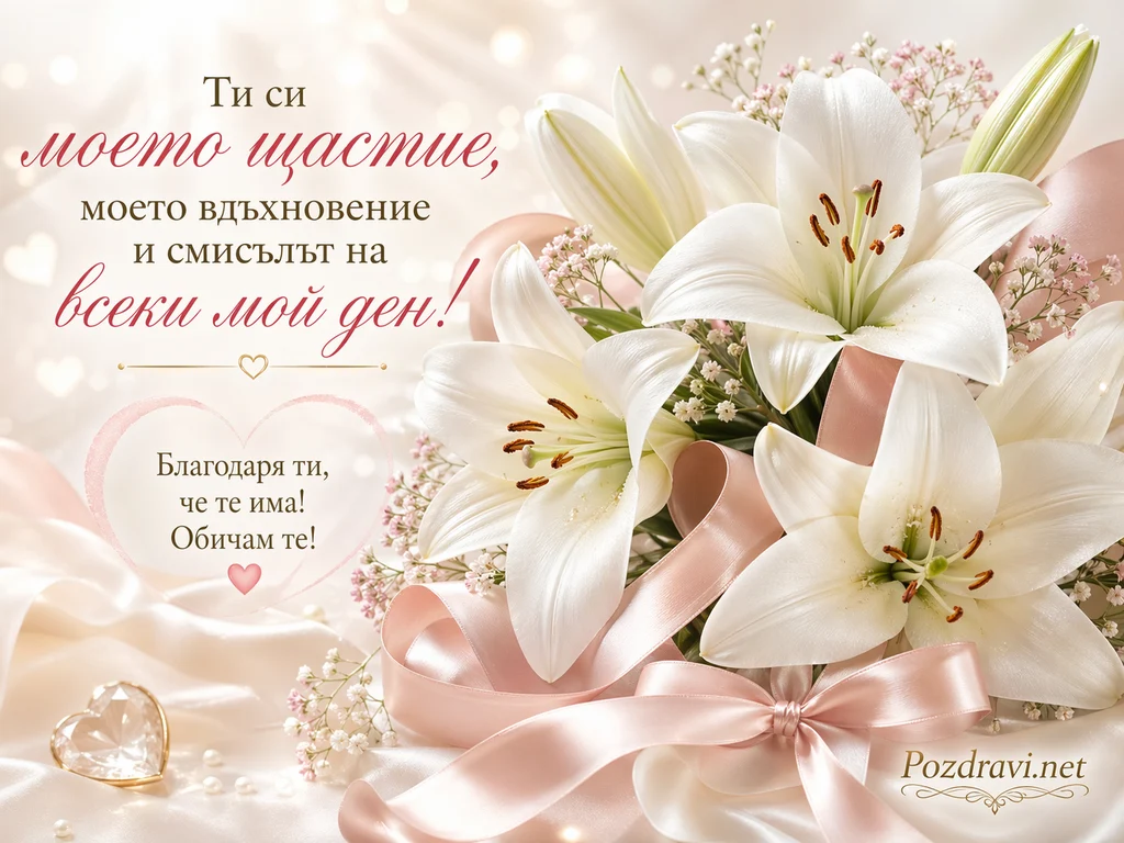 Върху светъл, ефирен фон с меки отблясъци са подредени големи бели лилии, които заемат дясната половина на композицията. Цветята са допълнени от нежни розови сатенени панделки и фини клонки с малки цветчета, което създава романтично и изискано усещане. Вляво има романтичен текст в бежово и розово, изпълнен с елегантен шрифт, който се откроява върху меката светлина. Надписът гласи: 'Ти си моето щастие, моето вдъхновение и смисълът на всеки мой ден!'. В сърцевидното поле под него е изписано: 'Благодаря ти, че те има! Обичам те!'. В долната част се виждат фини декоративни елементи като светли перли и искрящо кристално сърце, които подсилват нежното и любовно настроение на цялата сцена.