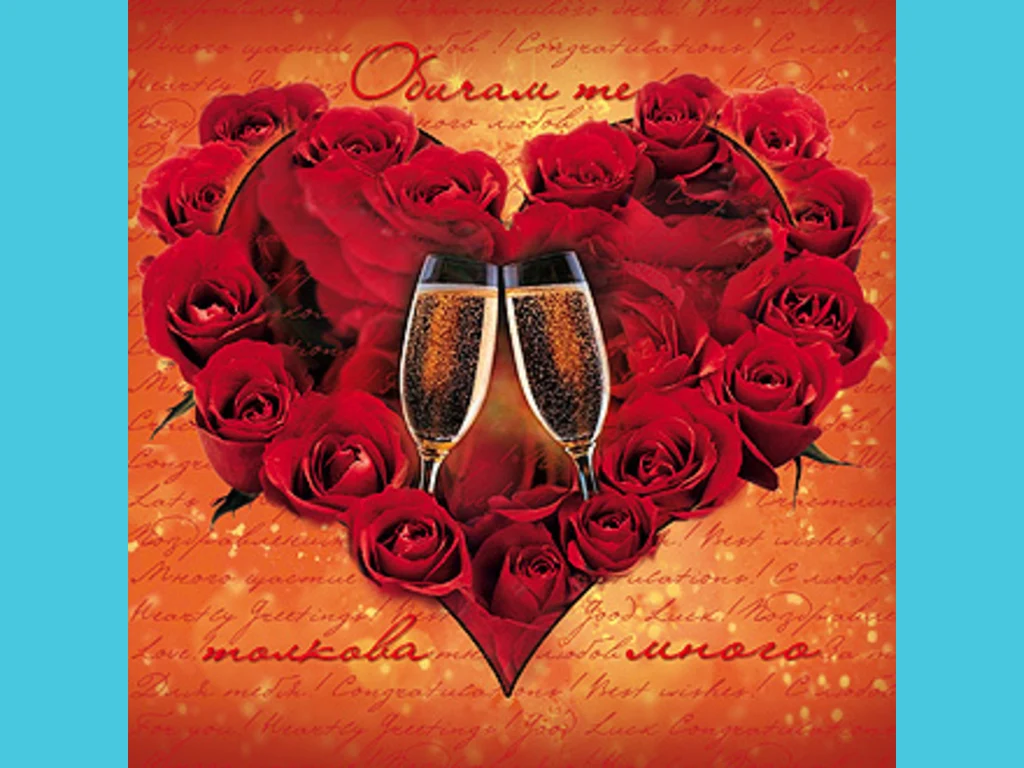 Ключови фрази: Голямо сърце разцъвнали алени червени рози две чаши пълни вино наздравица обич огромна