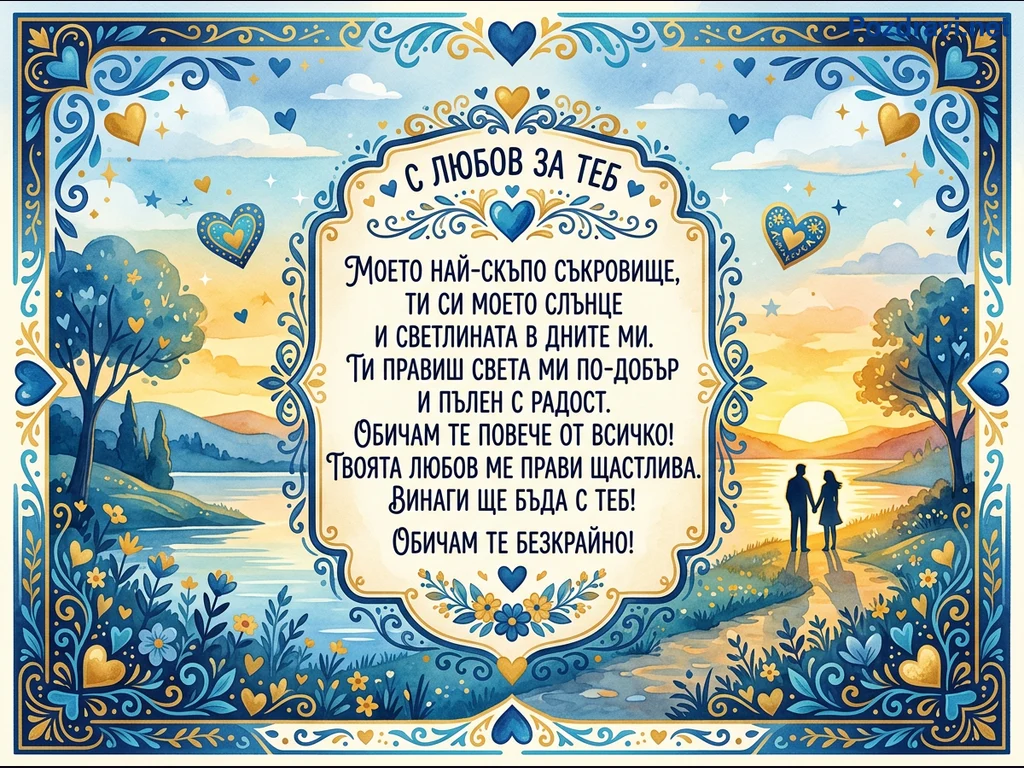 Тази романтична картичка в акварелен стил изобразява влюбена двойка, вървяща ръка за ръка по крайбрежна пътека по залез или изгрев. Пейзажът включва спокойно езеро или река, дървета и хълмове на хоризонта под небе с пухкави облаци и златни сърца. Централно място заема сърцевидна рамка с нежно любовно послание на български език, обградена от богато украсен син и златен орнамент с флорални мотиви и сърца. Цялостната композиция е изпълнена с топлина и нежност, подчертани от преобладаващите сини, златни и оранжеви тонове.
