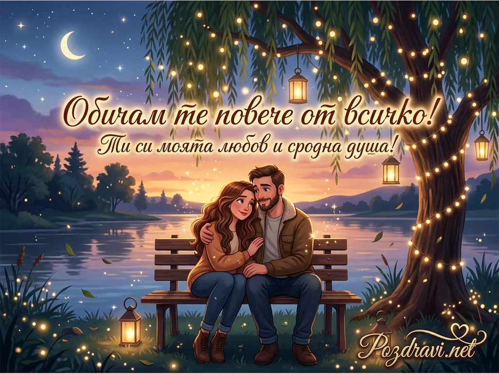 Млада влюбена двойка седи прегърната на дървена пейка край спокойно езеро. Вечерният пейзаж е озарен от множество приказни светлинки, висящи по клоните на голямо дърво и разпръснати по тревата, както и от фенери. На небето греят полумесец и звезди, създавайки романтична атмосфера. Над двойката е изписано посланието 'Обичам те повече от всичко! Ти си моята любов и сродна душа!'.