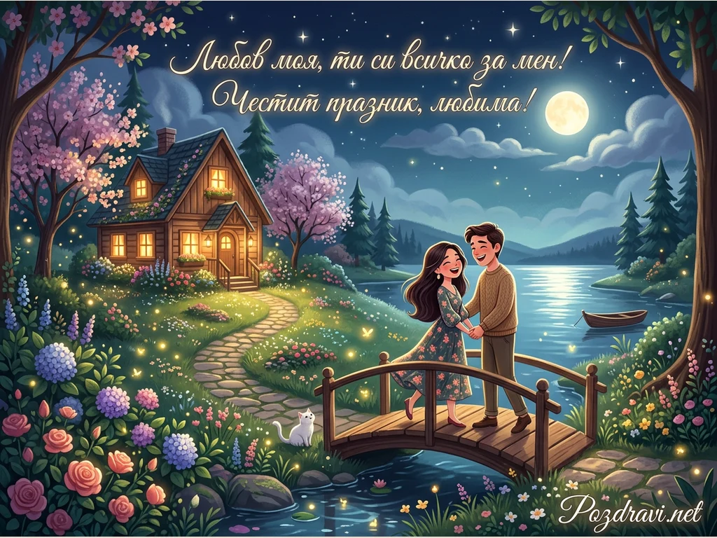 Картината изобразява романтична нощна сцена с влюбена двойка, държаща се за ръце на дървено мостче над поток. На заден план се вижда уютна дървена къща със светещи прозорци, заобиколена от цъфтящи дървета и цветя. Пълна луна осветява небето и се отразява във водите на езеро, докато светулки и малко бяло коте допълват идиличната атмосфера. Надписът гласи: 'Любов моя, ти си всичко за мен! Честит празник, любима!'.