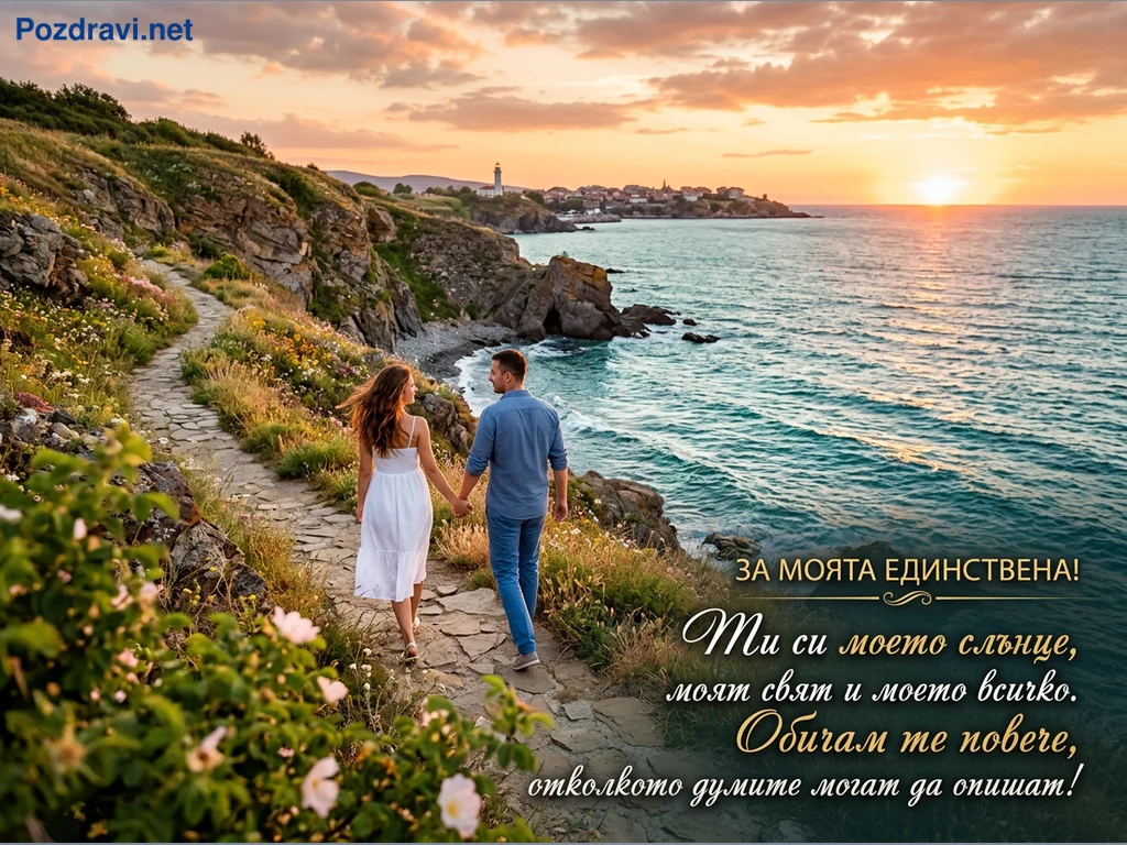 Млада двойка се разхожда ръка за ръка по калдъръмена пътека, която криволичи по живописен морски бряг. Около тях се простират зелени хълмове, осеяни с диви цветя, а вдясно тюркоазените води на морето отразяват златистите нюанси на залязващото слънце. На хоризонта се виждат силуетите на крайбрежен град с фар, добавяйки романтична атмосфера. Картичката носи послание 'ЗА МОЯТА ЕДИНСТВЕНА! Ти си моето слънце, моят свят и моето всичко. Обичам те повече, колкото думите могат да опишат!'.
