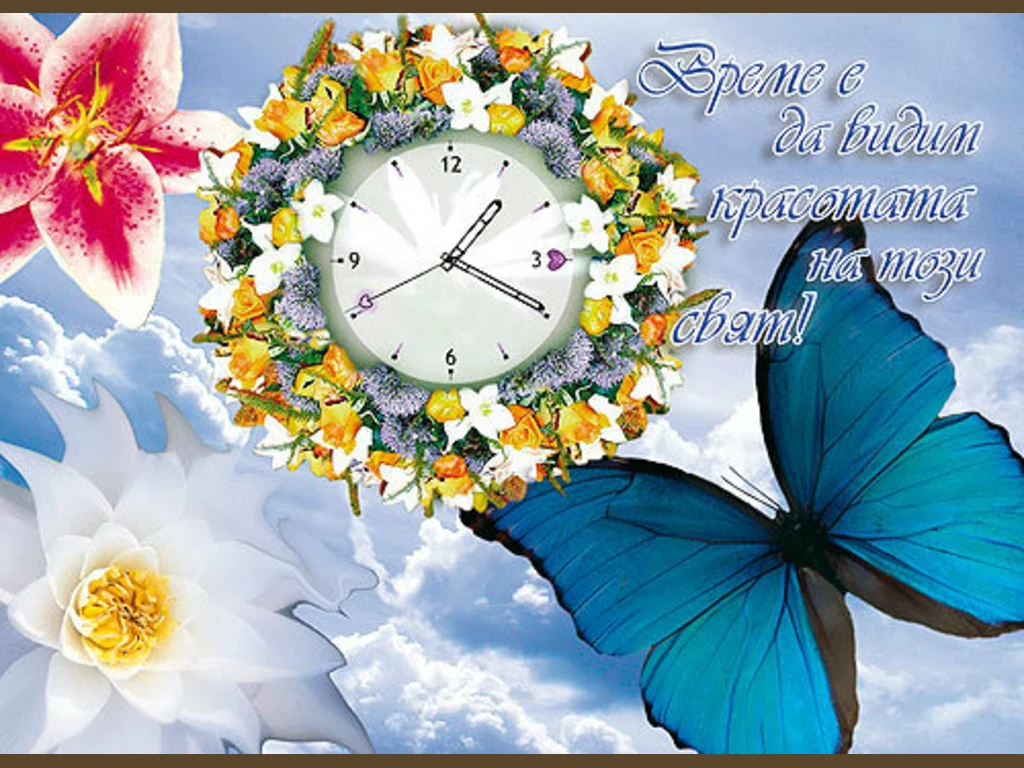 Ключови фрази: Картичка красив свят червена орхидея небе облаци синя пеперуда часовник венец полски цветя