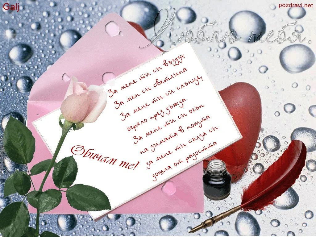 Ключови фрази: Картичка писмо любовно излияние обичам мастилница писалка перо красива роза капчици роса сълза дъщ радост