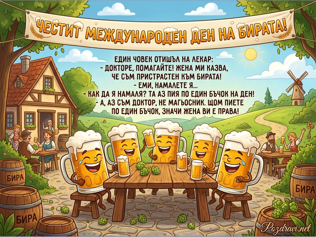 Тази празнична илюстрация отбелязва Международния ден на бирата с весел и цветен дизайн. В центъра на вниманието са пет анимирани халби бира с щастливи лица, седнали около дървена маса, заобиколени от хмел. На заден план се вижда живописна селска сцена с традиционна къща, хора, наслаждаващи се на напитки на открито, и вятърна мелница на хълм. Над всичко това е опънат транспарант с надпис 'ЧЕСТИТ МЕЖДУНАРОДЕН ДЕН НА БИРАТА!', а в средата е изписан хумористичен виц за бира. Цялостната атмосфера е радостна и приканваща към празнуване.