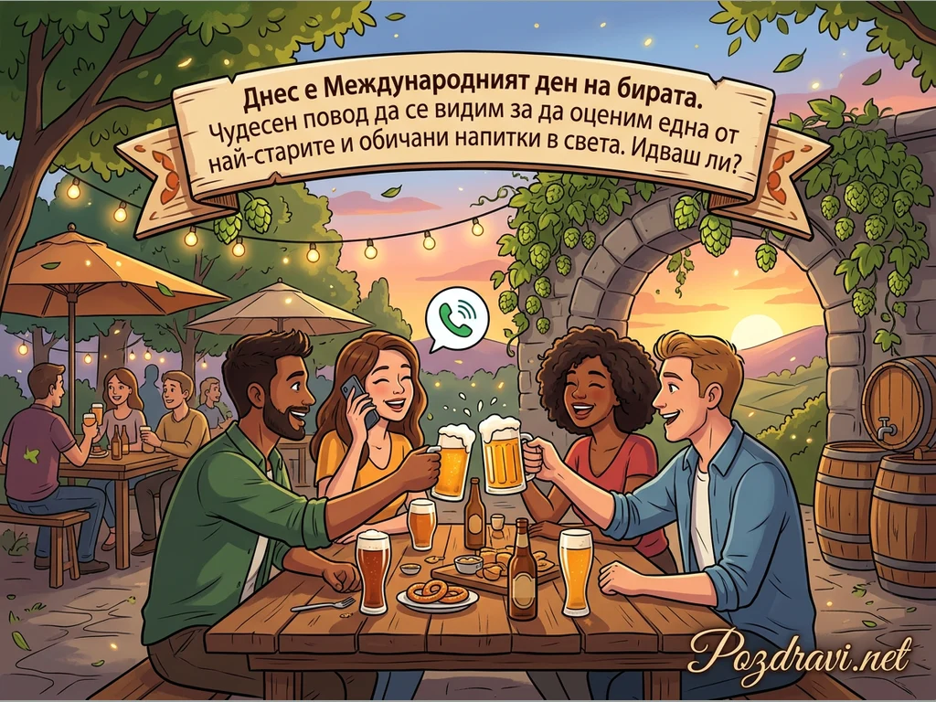 Четирима приятели се веселят на открито в бирена градина, вдигайки наздравици с халби бира. На масата пред тях има бутилки бира и солени гевречета, докато една от жените говори по телефона, символизирано от икона за WhatsApp обаждане. На заден план се виждат други хора, наслаждаващи се на напитки, както и арка, украсена с хмел, водеща към залез над хълмове. Над сцената е разположен транспарант, който обявява Международния ден на бирата и кани на среща. Цялата сцена излъчва празнична и приятелска атмосфера.