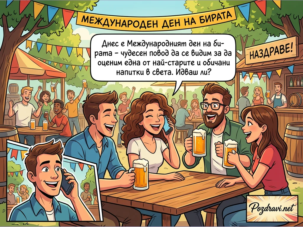 Картината изобразява оживен празник на открито, вероятно бирен фестивал или градина, украсен с цветни знамена. В центъра, група от четирима приятели се наслаждават на бира около дървена маса, смеейки се и разговаряйки, докато една от жените говори по телефона. На заден план се виждат множество други хора, които също празнуват, вдигайки наздрави с бира. Надписът 'МЕЖДУНАРОДЕН ДЕН НА БИРАТА' и балонче с текст подчертават повода за събитието, а табела 'НАЗДРАВЕ!' допълва празничната атмосфера. В долния ляв ъгъл има изрязан кадър на един от мъжете, който също говори по телефона.