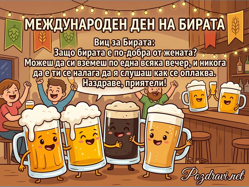 Тази весела илюстрация в анимационен стил отбелязва Международния ден на бирата. Тя показва оживена сцена в пъб, където няколко щастливи, антропоморфни халби бира – светла и тъмна – са на преден план, някои с ръце и крака, сякаш танцуват. На заден план, трима усмихнати души вдигат наздравици, обградени от празнична украса с лампички и флагове с хмел и житни класове. В облаче с текст е изписан хумористичен виц за бирата, завършващ с 'Наздраве, приятели!'. Цялостната атмосфера е на радост и празник.