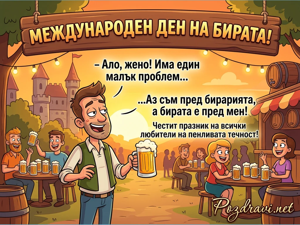 Тази весела карикатура отбелязва Международния ден на бирата, показвайки оживена бирария на открито по залез слънце. В центъра усмихнат мъж с халба бира в ръка 'разговаря' по телефона, обявявайки хумористично, че е пред бирата. Около него, други хора се наслаждават на пенливата напитка на маси, създавайки празнична атмосфера. Заден план включва замък, дървени бъчви и светещи гирлянди, допълващи веселото настроение.