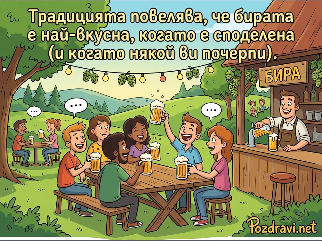 Множество усмихнати хора се наслаждават на бира на открито в оживена бирена градина или парк. В центъра голяма група приятели, включваща мъже и жени, седи около дървена маса, вдигайки наздравици с пълни халби и разговаряйки весело. Отдясно, барман налива бира от кран в дървен щанд, а на заден план други двойки също пият под дърветата. Над сцената висят лампички с хмел, създавайки празнична атмосфера. Текстът гласи: 'Традицията повелява, че бирата е най-вкусна, когато е споделена (и когато някой Ви почерпи).'