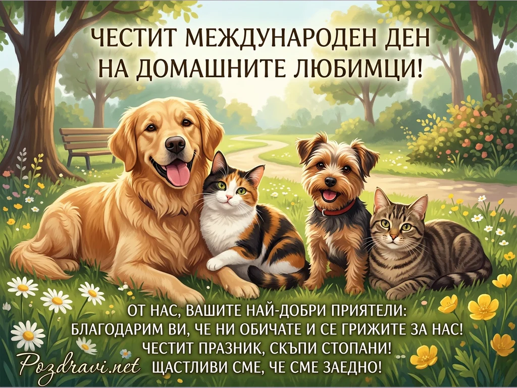 Тази жизнерадостна илюстрация показва четири щастливи домашни любимци – златен ретривър, трицветна котка, йоркширски териер и шарена котка – позиращи заедно. Те са разположени в живописен зелен парк с дървета, извит път и цъфтящи маргаритки и жълти цветя. В горната част на картичката е изписано 'ЧЕСТИТ МЕЖДУНАРОДЕН ДЕН НА ДОМАШНИТЕ ЛЮБИМЦИ!', а отдолу има сърдечно послание от животните към техните стопани. Цялостната атмосфера е топла, празнична и изпълнена с благодарност, идеална за отбелязване на специалния ден на нашите верни приятели.