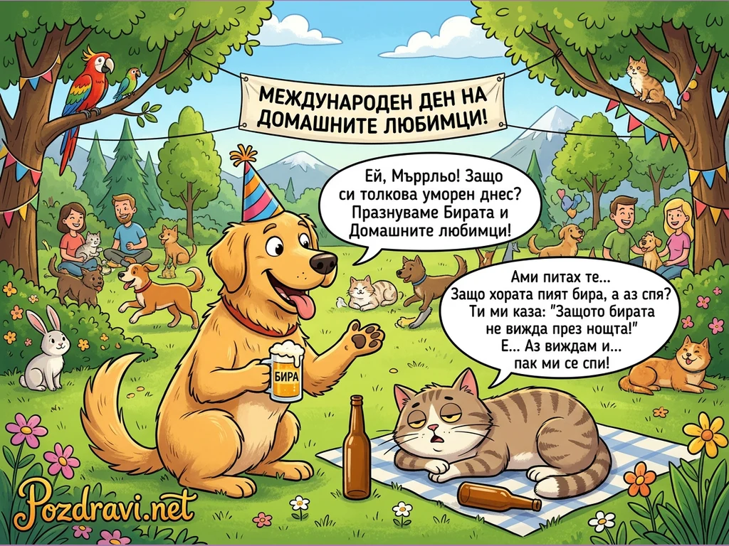 Ключови фрази: Международен ден домашни любимци, Куче котка бира, Забавни животни, Празник домашни любимци, Хумористична илюстрация