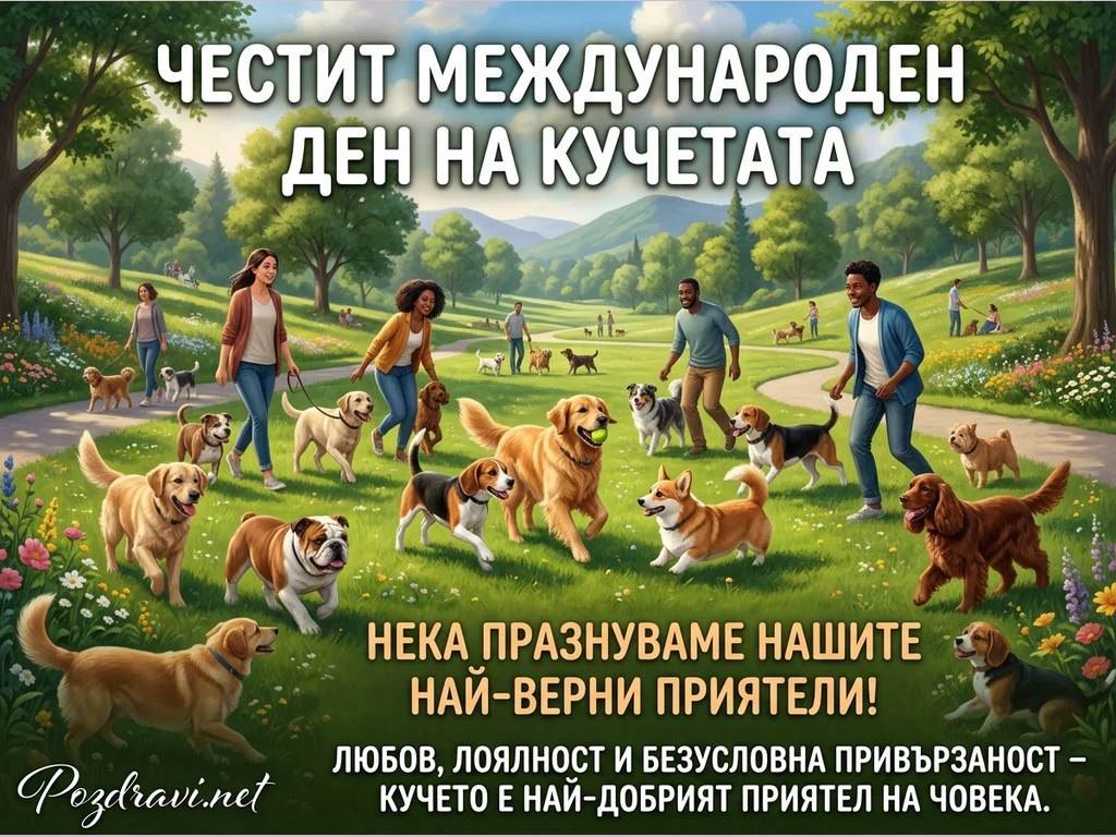 Ключови фрази: Международен ден на кучетата, поздрави за кучета, кучета в парка, щастливи кучета, празник на домашните любимци