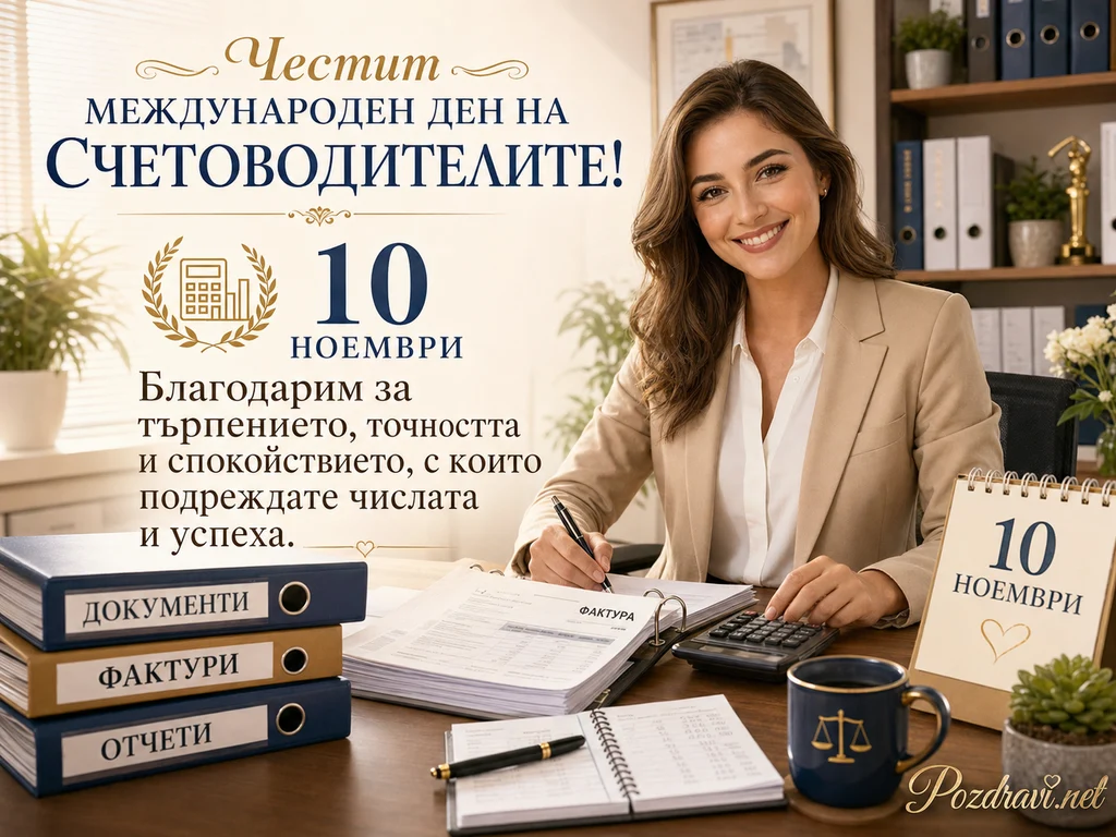 На картичката се вижда усмихната жена в елегантен бежов костюм, седнала на бюро в светъл офис с папки, документи и калкулатор. Надписът гласи: 'Честит МЕЖДУНАРОДЕН ДЕН НА СЧЕТОВОДИТЕЛИТЕ! 10 НОЕМВРИ Благодарим за търпението, точността и спокойствието, с които подреждате числата и успеха.' До текста има златна икона с калкулатор, поставена в лавров венец, която подчертава професионалния характер на празника. На бюрото са подредени папки с етикети 'ДОКУМЕНТИ', 'ФАКТУРИ' и 'ОТЧЕТИ', както и отворена папка с фактура. Вдясно има настолен календар с дата 10 ноември, чаша със символ на везни и малко растение. Атмосферата е топла, подредена и делова, с акцент върху уважението към счетоводителите и тяхната прецизна работа.
