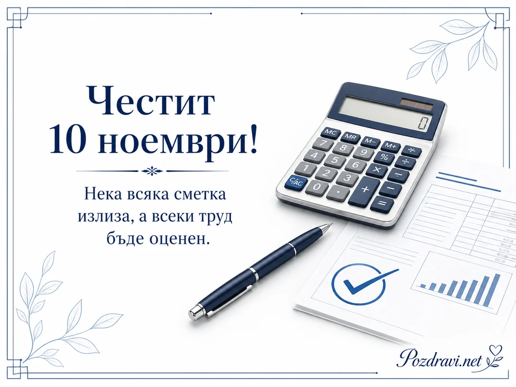 Картичката е посветена на 10 ноември и е оформена в елегантна бяло-синя гама. Вляво е изписан надписът 'Честит 10 ноември! Нека всяка сметка излиза, а всеки труд бъде оценен.'. В дясната част има калкулатор с голям дисплей, поставен върху документи с таблици и графики. До документите лежи тъмносин химикал, който допълва деловото усещане на композицията. Фините сини линии, рамката и растителните орнаменти придават изчистен и празничен вид. Темата насочва към професионален празник, свързан със сметки, отчетност, труд и признание. Цялостното излъчване е спокойно, подредено и подходящо за поздрав към счетоводители и финансови специалисти.