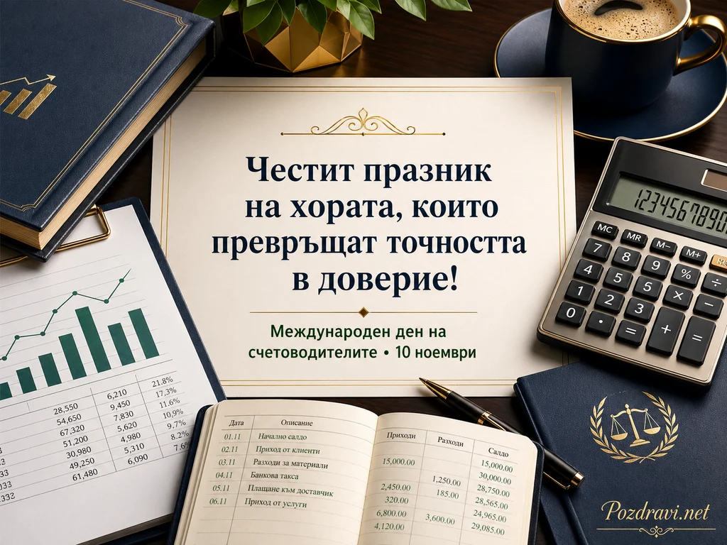Елегантна празнична картичка е поставена върху тъмно дървено бюро, заобиколена от предмети, свързани със счетоводство, финанси и професионална прецизност. В центъра на картичката е изписано: 'Честит празник на хората, които превръщат точността в доверие!'. Под основния поздрав стои допълнителният надпис: 'Международен ден на счетоводителите • 10 ноември'. Около картичката се виждат калкулатор, счетоводна книга, химикал, тефтер с графики и таблици, както и стилна чаша кафе. Цветовете са тъмносини, златисти и кремави, което създава усещане за престиж, надеждност и професионализъм. Композицията подчертава уважението към счетоводителите като хора, които работят с числа, ред и отговорност. Декоративните златни линии върху картичката допълват официалния характер на поздрава.