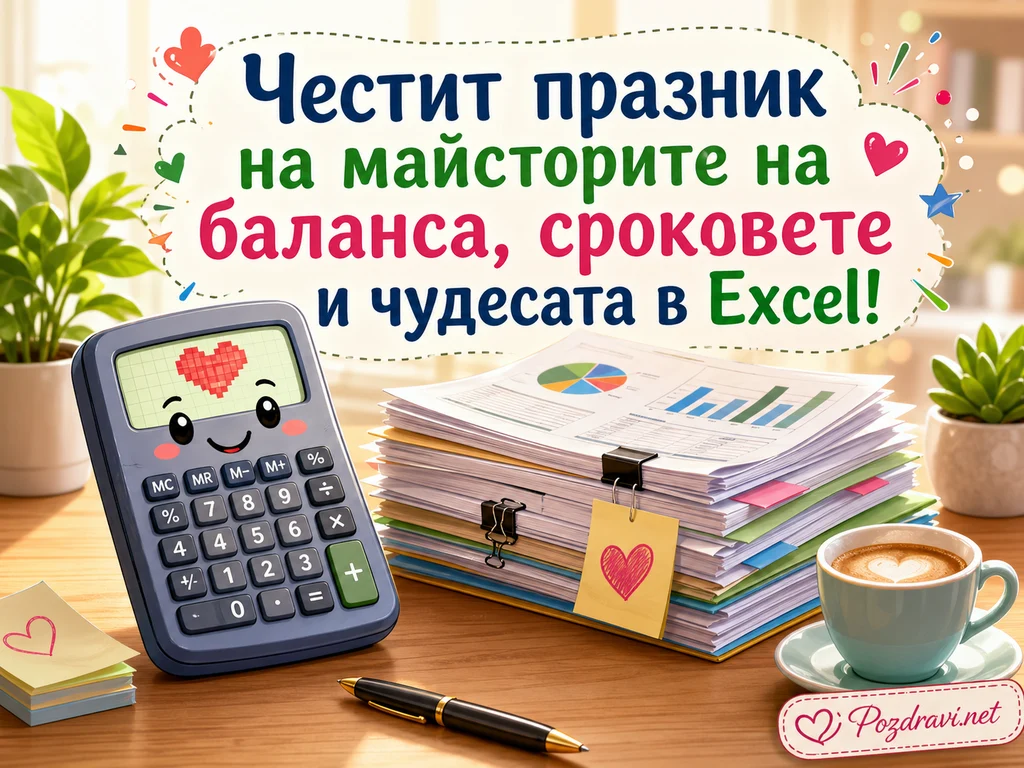Картичката е посветена на хората, които работят с финанси, срокове, отчети и Excel. В горната част е изписан голям цветен надпис: 'Честит празник на майсторите на баланса, сроковете и чудесата в Excel!'. На бюрото има усмихнат калкулатор със сърце на дисплея, който придава весел и закачлив характер на сцената. До него е подредена висока купчина документи с графики, диаграми, цветни разделители и щипки. Пред купчината стои бележка със сърце, а наблизо има химикалка и малки листчета. Вдясно се вижда чаша кафе с лате арт, която подсказва работна атмосфера и кратка почивка сред задачите. Около надписа има сърца, звезди и празнични цветни елементи, които правят картичката топла и жизнерадостна.